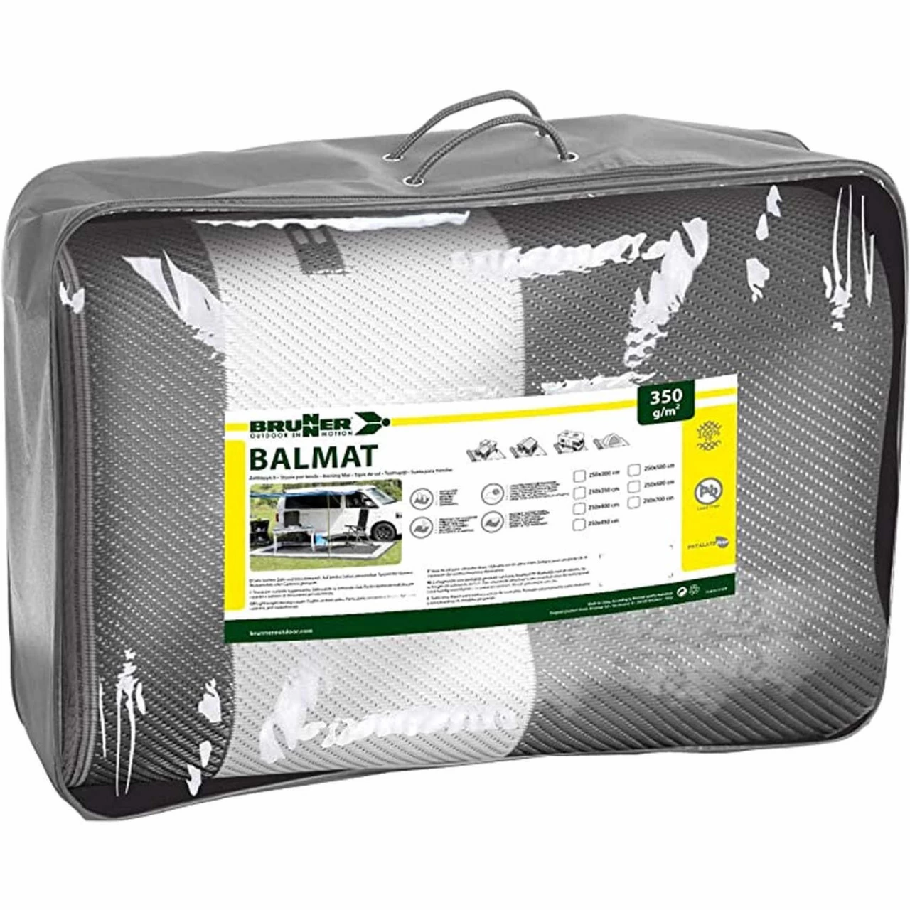 Der Brunner Balmat ist ein sehr leichter Zelt- und Vorzeltteppich speziell für kleinere Wohnmobile oder Caravans. Er ist aus zu 100% aus bleifreiem, phthalatfreiem Polypropylen hergestellt. Der Brunner Balmat kann beidseitig verwendet werden und hat an jeder Ecke eine Öse, an der er mit Heringen befestigt werden kann, damit er nicht verrutscht. Die spezielle Struktur des Teppichs ermöglicht es der darunter liegenden Wiese zu atmen.