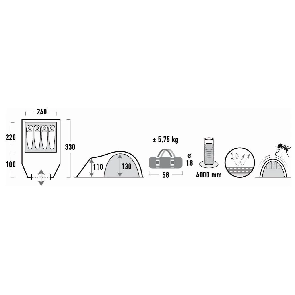 Das praktische High Peak Talos 4 Campingzelt bietet in einem großzügigen Schlafraum genügend Platz für vier Personen oder drei Personen mit Gepäck. Der Vorbau ist mit einem fest eingenähten Zeltboden ausgestattet, der nicht verrutscht und mit Faulstreifen versehen, die Schmutz aus dem Vorbau fernhalten. Durch den wettergeschützten Eingang betreten Sie Ihr Zelt trockenen Fußes. Klarsichtfolien-Fenster füllen das Zelt mit Licht. Zum Schutz Ihrer Privatsphäre sind diese mit Gardinen verschließbar. Drei wetterfeste Dauerventilationsöffnungen belüften das Zelt ideal und sollten immer geöffnet sein. Die Tür des Innenzeltes ist mit einem Gazeeingang ausgestattet, der störende Insekten aus Ihrem High Peak Talos 4 fernhält. Weitere Ausstattungsmerkmale umfassen Innenzelttaschen und einen Lampenhalter.