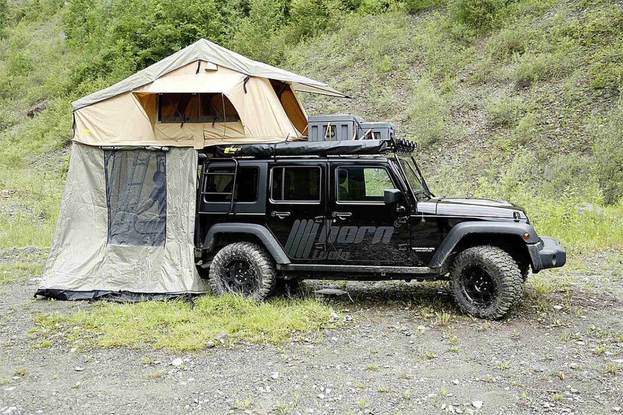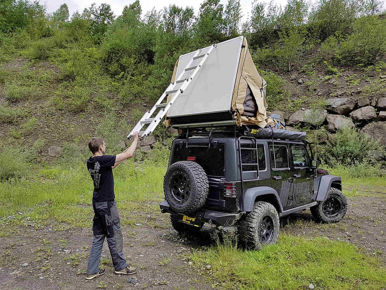 Das horntools GmbH Dachzelt Desert I 165 cm eignet sich perfekt für zwei Personen, die bei ihrem Abendteuerurlaub auf nichts verzichten möchten. Es passt für fast alle Fahrzeuge, vom kleinen VW Polo bis zum Land Rover Defender. Durch das hochwertige Segeltuchgewebe (Baumwollmischgewebe) ist das Dachzelt besonders atmungsaktiv und ein Überdacht aus Polyester sorgt für einen Schutz vor Regen. In das Innere des Zeltes gelangst du durch den Einstieg von unten, sodass du vor Wind und Wetter bestens geschützt bist. Das Zelt verfügt über drei Fenster, die seitlich geschlossen werden können. Darüber hinaus sind sie mit Moskitonetzen ausgestattet, sodass du einen ruhigen und angenehmen Schlaf hast. Des Weiteren verfügt das Dachzelt Desert I 165 cm über einen robusten, wasserdichten Gummi-Innenboden, den du bei Bedarf auch herausnehmen kannst. Das Vorzelt ist mit einem YKK Reißverschluss in 3 Minuten am Dachzelt befestigt. Im Lieferumfang enthalten sind: Dachzelt + Abdeckung, Regenüberzug, Vorzelt + Innenboden, 80 mm Matratze, Dachträger-Befestigungsmaterial, Werkzeug für den Aufbau, Spannstangen für die Ausstellfenster, Abspannschnüre und Karabiner, Bedienungs- und Pflegeanleitung!