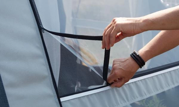 Atmungsaktives Wohnwagenvorzelt mit großzügigem Vordach und Insektenschutz