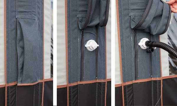 Dank des benutzerfreundlichen Verriegelungssystems “On/Off” kann jeder Luftkanal separat abgedichtet werden, was ein Höchstmaß an Sicherheit bietet. Zusätzlich stehen zur Abdichtung am Wohnwagen zwei zusätzliche Luftschleusen zur Verfügung. Je nach Form des Wohnwagens können diese separat aufgeblasen werden, um sich optimal an Ihren Wohnwagen anzupassen.