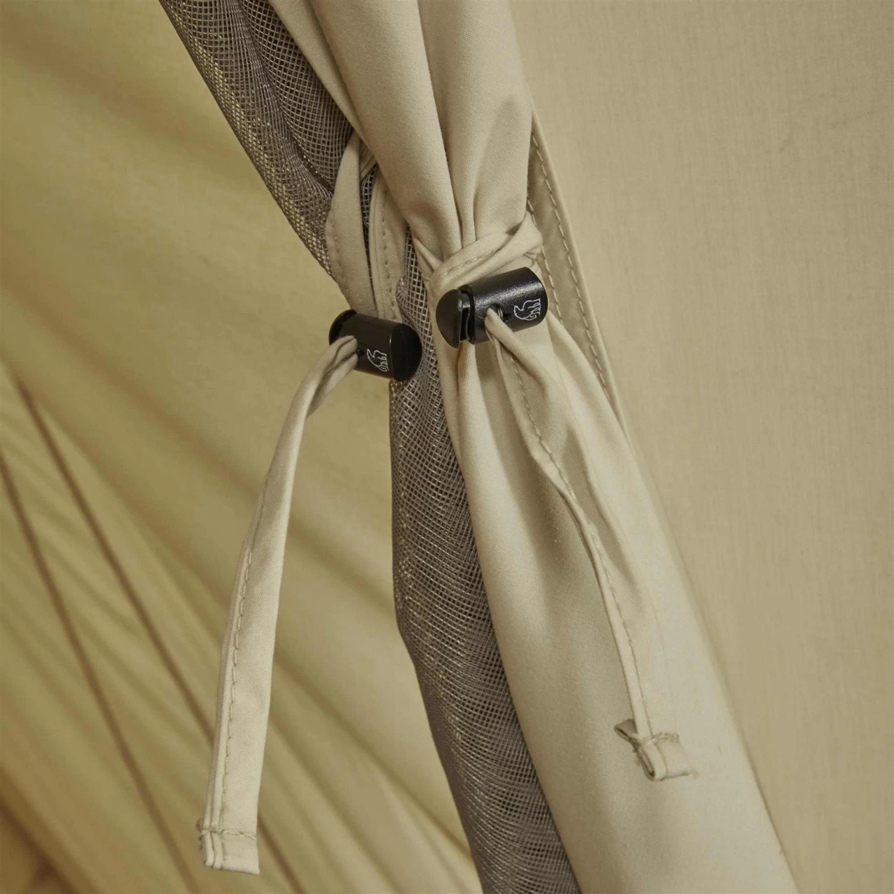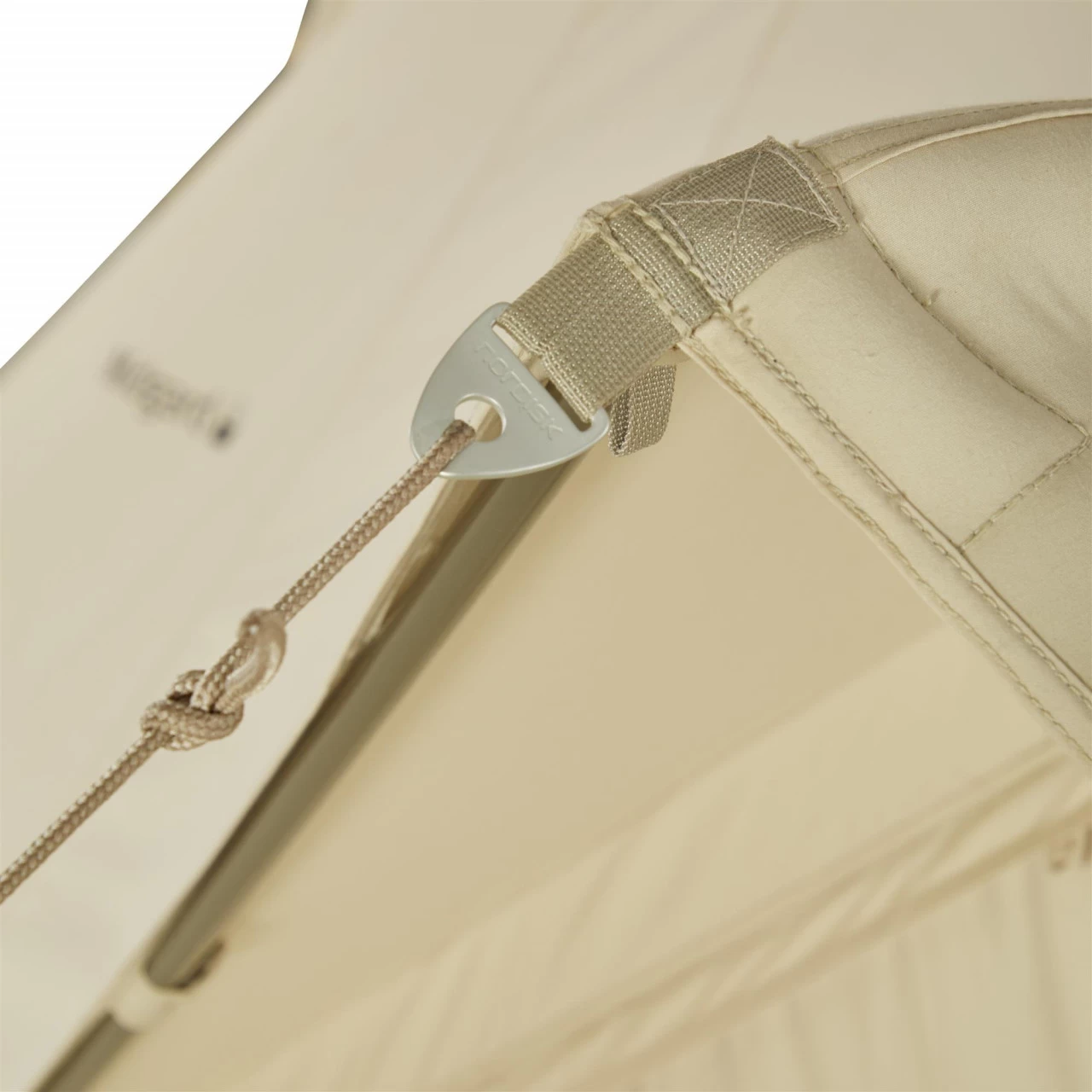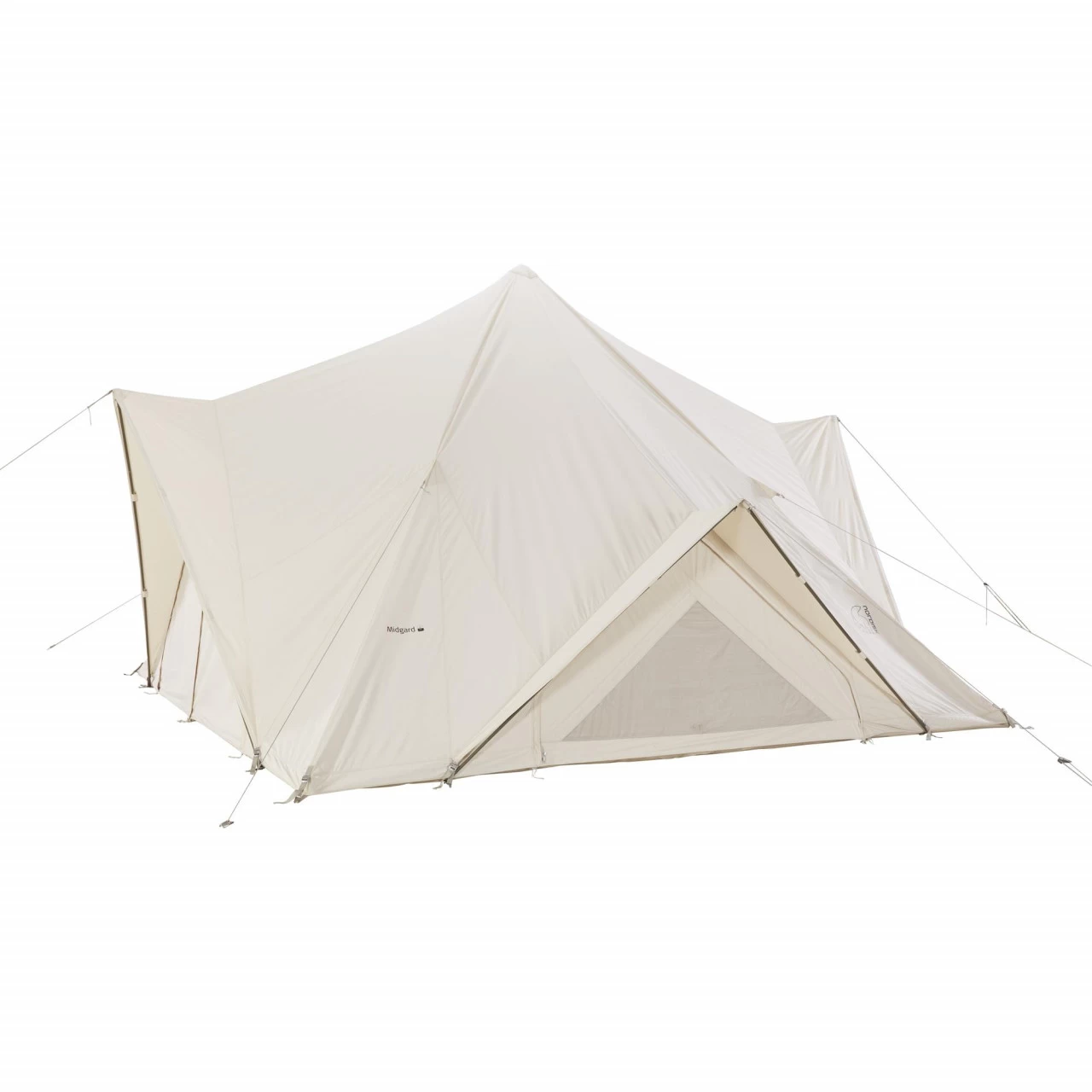 Das Nordisk Midgard 20 Gruppenzelt ist ein stangenfreies Baumwoll-Mischgewebe Zelt, welches in einem innovativen Design gehalten ist. Es lässt sich schnell und leicht aufbauen. Im Zelt selbst finden bis zu 10 Personen problemlos Platz und der geräumige Wohnbereich dient gleichzeitig als Schlafbereich. In das Innere des Zeltes gelangst Du durch einen der beiden Eingänge. Im Inneren des Midgard 20 hast Du durch die 3 Meter Zelthöhe eine zentrale Stehöhe. Durch die Fenster und Türen kommt besonders viel Licht und Luft in das Zelt. Dies sorgt für ein helles und belüftetes Zeltklima. Darüber hinaus sind die Fenster und Türen mit Moskitonetzen ausgestattet, sodass keine Insekten hineinkommen können. Zu den weiteren Ausstattungsmerkmalen des Midgard 20 gehören unter anderem ein großes Vordach über dem Eingang, welches einen sicheren Zugang ins Innere gewährt, aber auch vor Witterungseinflüssen schützt und eine stangenfreie Optik, da es keine störende Mittelstange gibt. Außerdem lässt sich das Midgard 20 mit dem Vimur-Serie in der Größe und Fläche erweitern.