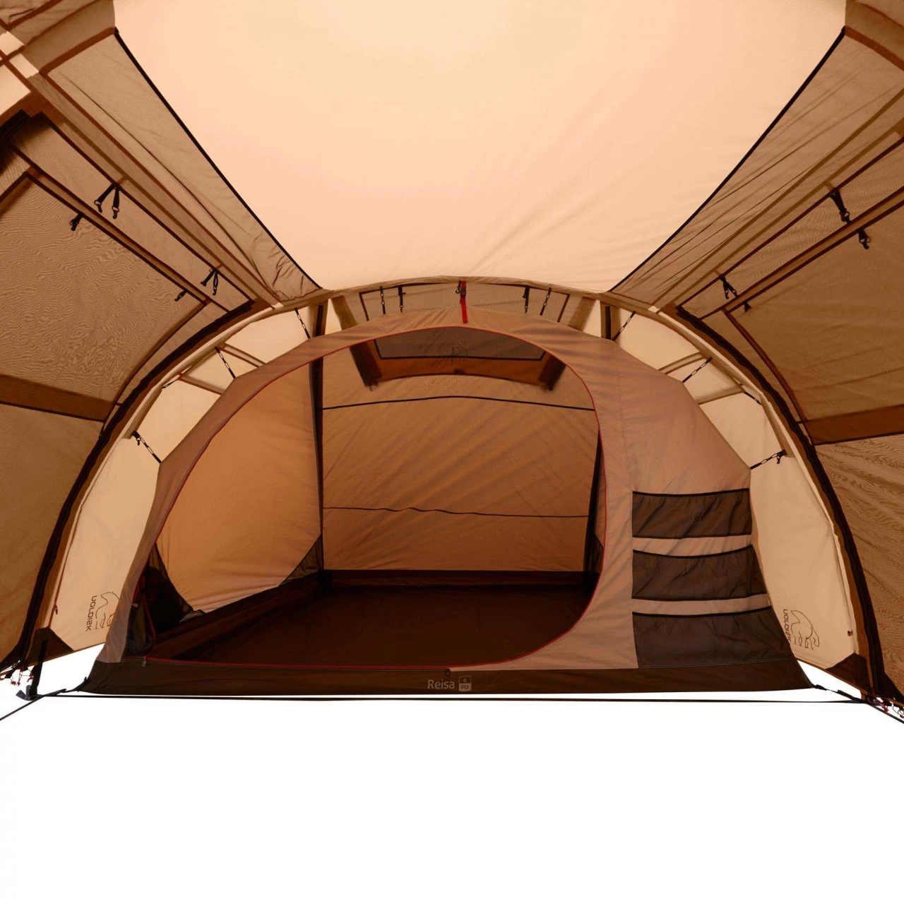 Das Nordisk Reisa 6 PU Familienzelt eignet sich hervorragend für einen Familienurlaub zu sechst. In das Innere des Zeltes gelangst Du durch eine der beiden Türen. Die Türen können komplett geöffnet und als Sonnendach aufgestellt werden. Außerdem bestehen die Türen aus zwei Schichten mit No-See-Um-Netz und Fenstern mit integrierten Rollvorhängen. Somit ist Dein Zelt schön lichtdurchflutet und hat ein angenehmes Zeltklima. Bei Bedarf können die Fenster für mehr Privatsphäre verschlossen werden. Im Inneren des Zeltes befinden sich zwei Schlafkabinen, die mit eingenähten Bodenwannen versehen sind, sodass in Deiner Schlafumgebung ein angenehmes Klima herrscht. Die größere Schlafkabine kann bei Bedarf noch einmal in zwei geteilt werden. Die kleinere Schlafkabine kann bei Bedarf abgetrennt und als zusätzlicher Stauraum oder Apsis verwendet werden. Zu den weiteren Ausstattungsmerkmalen des Reisa 6 PU gehören unter anderem mehrere Aufbewahrungstaschen und Haken im Zelt, um dieses ein wenig wohnlicher zu machen, zusätzliches Gestänge, um das Sonnendach zu fixieren und Deckeltaschen für schnelles Verstauen der Windfangtüren. Platz für Dein Gepäck oder Deine Schuhe hält der hohe Zwischenraum bereit, der die beiden Schlafkabinen voneinander trennt. Kleinigkeiten oder besonders wichtige Ausrüstungsteile sind somit in Deiner Nähe!
