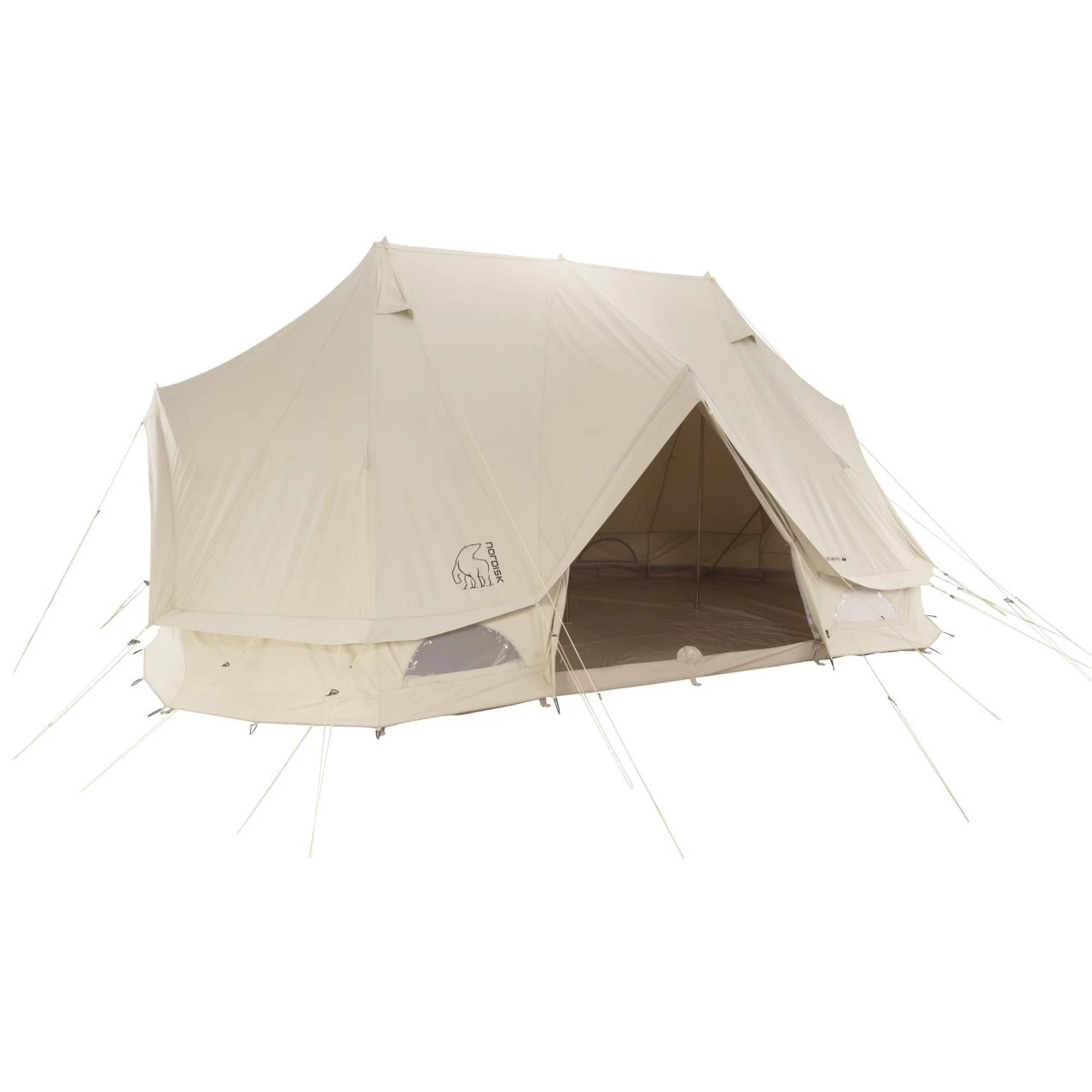 An den Zeltwänden befinden sich große Seitenfenster mit Vorhängen, um die Privatsphäre zu wahren. Die D-Fenster sind mit Reißverschlüssen versehen. Alle Fenster und Türen sind mit Mesh-Material verarbeitet: so können die Insekten und Kriechtiere draußen bleiben.