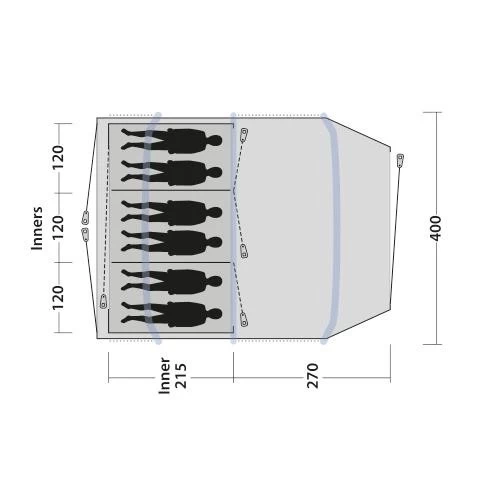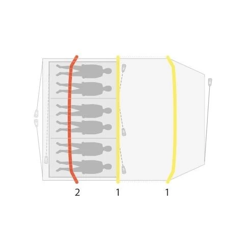 Für einen Campingurlaub mit der Familie oder mit Freunden ist das Outwell Starhill 6A eine gute Wahl. Die außen liegenden Luftkanäle sorgen für noch mehr Kopffreiheit im Inneren des Zeltes. Ein zweiter Eingang auf der Zeltrückseite ermöglicht es dir, direkt in die Schlafkabine zu gelangen oder diese zu verlassen, ohne durch den Wohnbereich zu gehen. Durch das Moskitonetz am 2. Eingang hast du zusätzlich noch die Möglichkeit der besseren Belüftung in der Schlafkabine. Das helle Dach über dem Wohnbereich schafft eine helle, freundliche Atmosphäre. Einen erholsameren Schlaf bekommst du in der abgedunkelten Premium Schlafkabine, die bei Bedarf auch in 3 separate Kabinen geteilt werden kann. Die Kabeldurchführungen ins Zelt sowie auch in die Schlafkabine ermöglichen es dir, Strom auch ins Innenzelt zu legen. Große, getönte Fenster im Wohnbereich können mit einem Vorhang verhängt werden, wenn ihr mehr Privatsphäre braucht. Das HookTrack-System im Starhill 6A schafft flexible Möglichkeiten, Lampen oder andere Dinge bis zu 1,5 kg aufzuhängen.