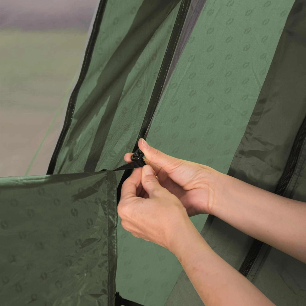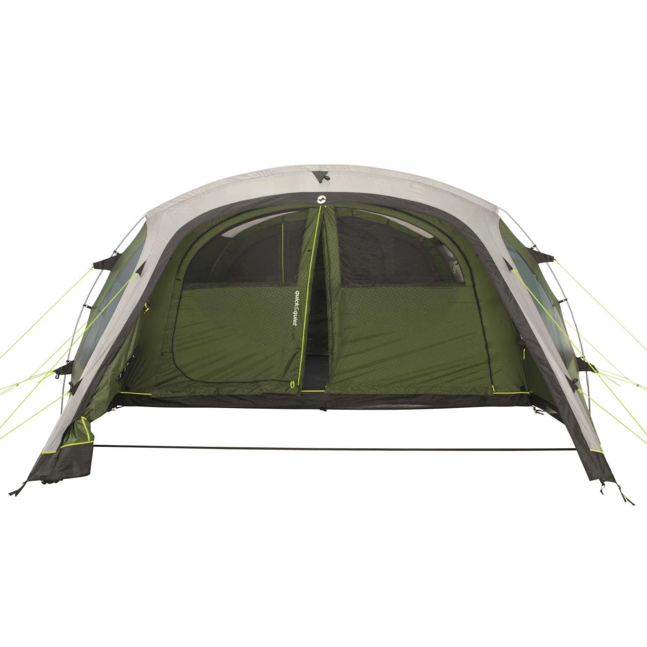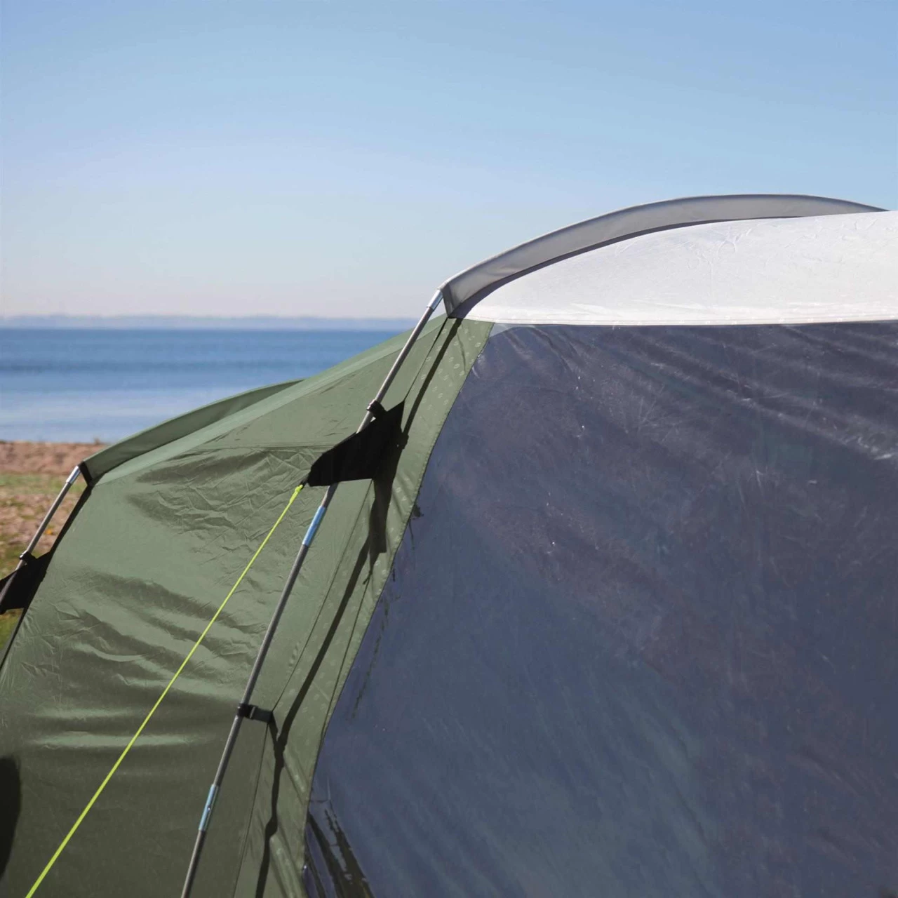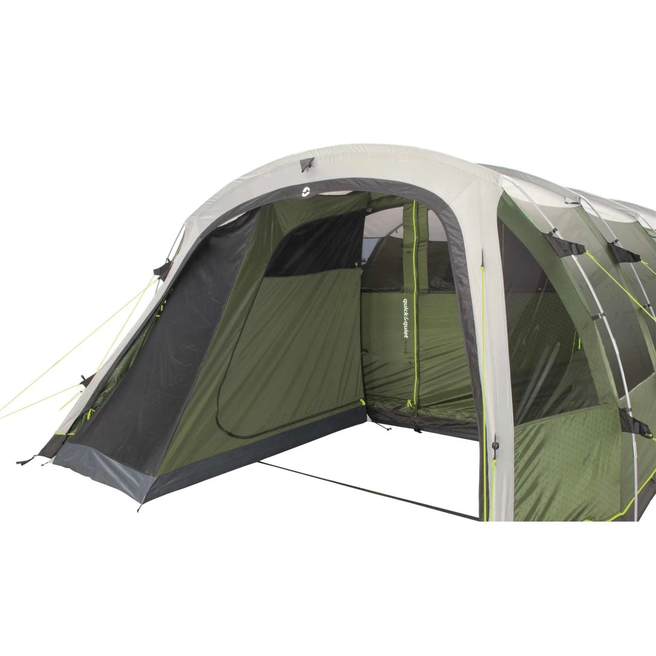 Der Eingang zum Wohnbereich ist mit der patentierten Quick & Quiet Door ausgestattet. Durch den Magnetmechanismus kannst du das Zelt nahezu geräuschlos betreten oder verlassen. Wenn du die Magnetfunktion nicht nutzen willst, kannst du die Tür mit einem doppelten Reißverschluss komplett öffnen. Um dein Winwood 8 komplett zu verschließen, verbindest du die Tür einfach mit der fest eingenähten Bodenplane und schon kommt kein Insekt mehr ins Zelt. An der Seite des Wohnbereichs befindet sich ein zusätzlicher Eingang, der dir noch mehr Flexibilität beim Camping ermöglicht. Das Dach über dem Wohnbereich ist aus einem hellen Material hergestellt und schafft so ein helles, angenehmes Wohnambiente im Zelt. Die großen Fenster an der Seite sind leicht getönt und schützen so vor der direkten Sonneneinstrahlung. Wenn du dich vor neugierigen Blicken der Nachbarn schützen willst, kannst du die Fenster einfach mit Vorhängen verschließen.