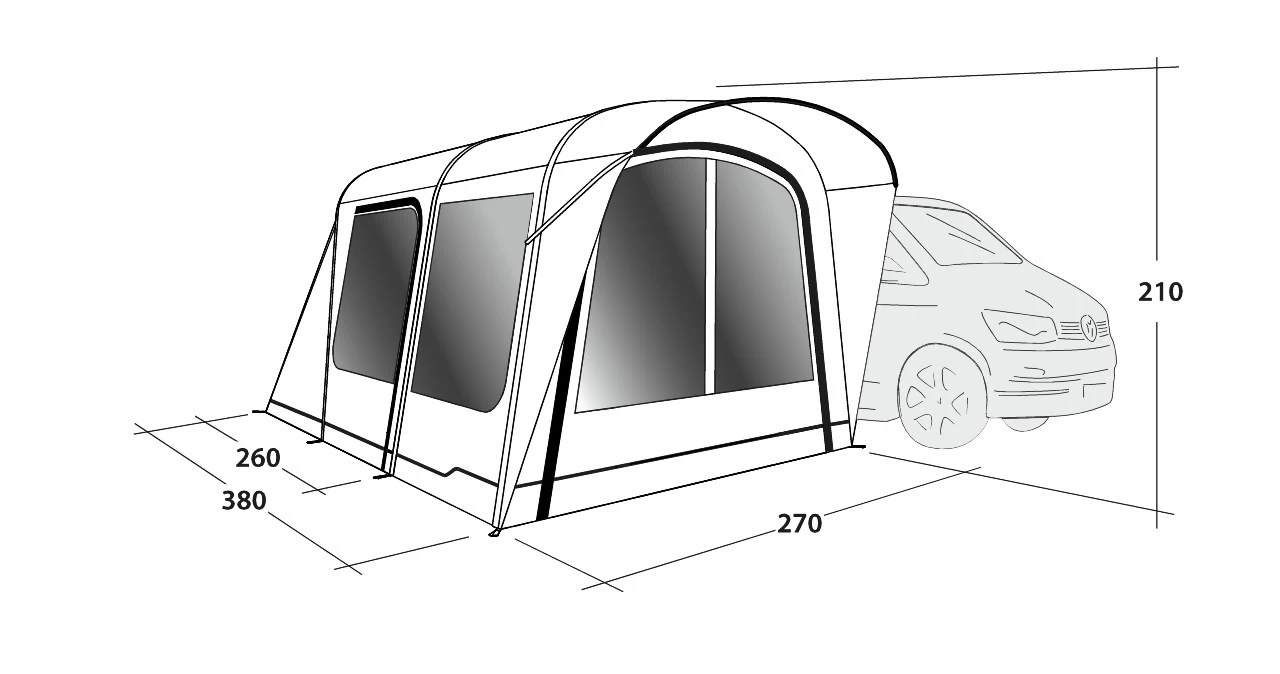 Das Outwell Wolfburgburg 380 Air Busvorzelt ist ideal für Dich, wenn Du in Deinem Urlaub nicht nur an einem Fleck bleiben möchtest. Du kannst das Luft-Vorzelt einfach stehen lassen und Tagesausflüge machen. Es eignet sich sehr gut für Fahrzeuge mit einer Anschlusshöhe von 175-200 cm. Die Fronttür und die Seitentüren wurden mit einem Moskitonetz ausgestattet. So kannst Du die Tür auch an lauen Abenden geöffnet lassen und wirst nicht von Insekten gestört. Die Fronttür kann bei Bedarf auch komplett zur Seite gerollt werden, sodass Du Dich fühlst als würdest Du direkt im Freien sitzen. Große, leicht getönte Fenster lassen Tageslicht ins Innere des Wolfburg 380 Air. Möchtest Du Dich vor neugierigen Blicken schützen, kannst Du die Gardinen einfach verschließen. Vorgeformte Luftschläuche sorgen für große Kopffreiheit und viel Platz im Inneren. Der Wohnraum wurde mit dem HookTrack System ausgestattet, an dem Du unkompliziert Beleuchtung und Kabel befestigen kannst. Eine herausnehmbare Bodenplane mit Zugluftstopper ist ebenfalls vorhanden. Doppelt angebrachte Keder (Stärke 5 mm) sorgen dafür, dass Du Dein Fahrzeug ohne Probleme anbringen kannst. Möchtest Du eine Schlafkabine oder einen weiteren Raum für Dein Zelt haben, kannst Du diese optional dazu bestellen.