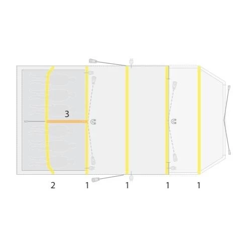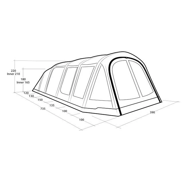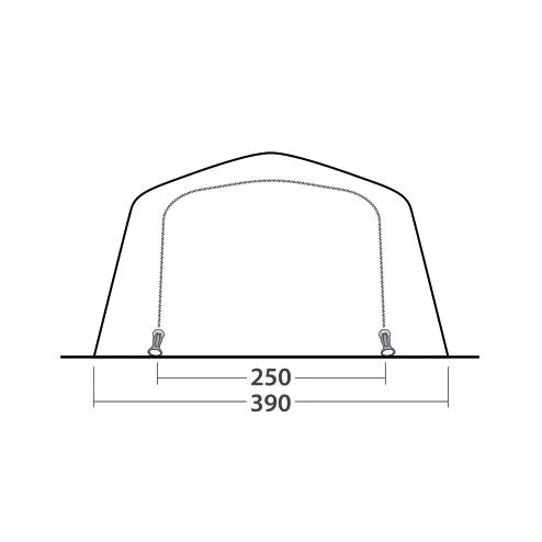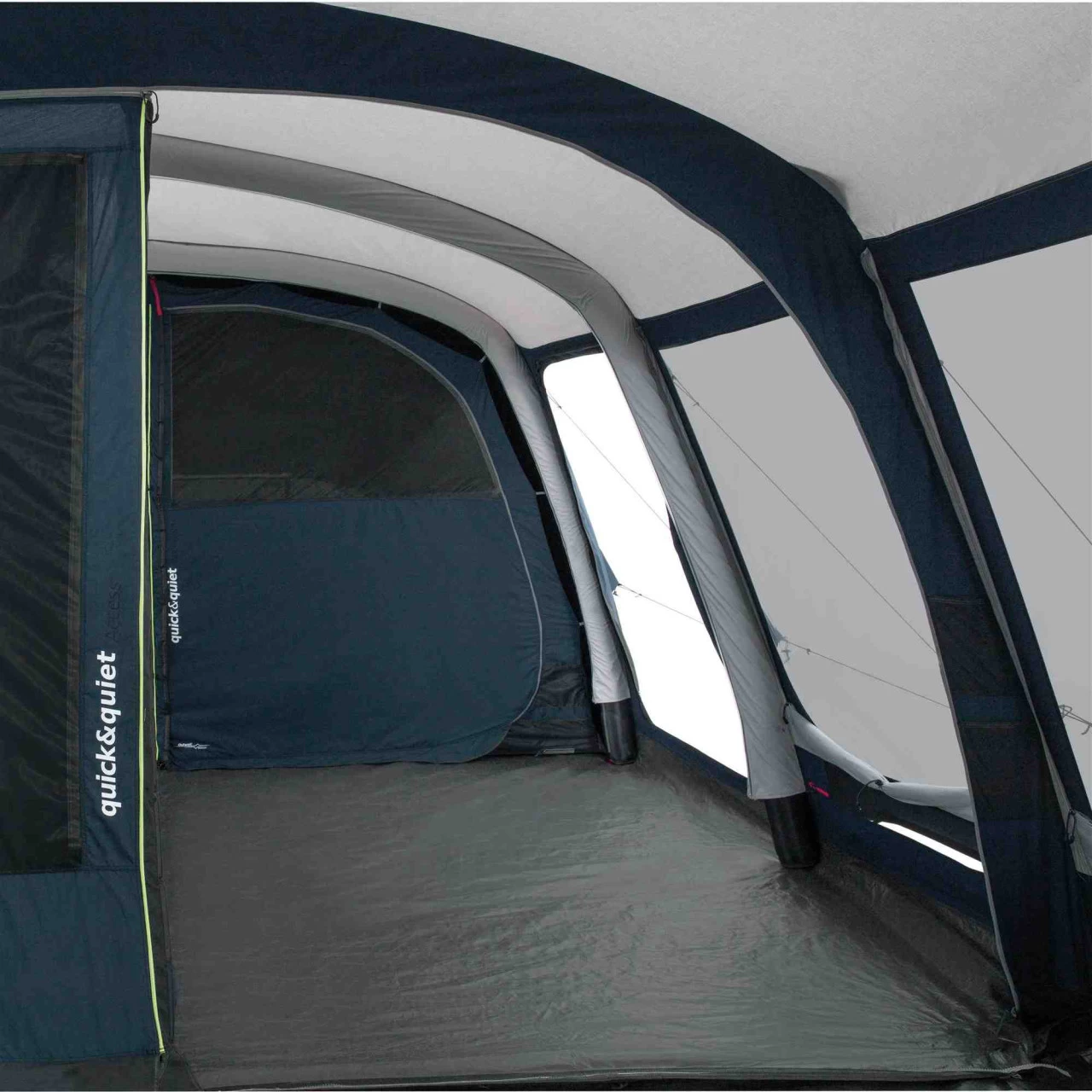 Die große Ambassador Schlafkabine mit einer Tiefe von 230 cm und voller Stehhöhe kann mit Hilfe eines Reißverschlussvorhangs in 2 Einzelkabinen geteilt werden. Das abgedunkelte Material an Wänden und Decke sorgt dafür, dass es im Innenzelt länger dunkel bleibt und ihr so einen erholsameren Schlaf bekommt. Ein manuell anzubringender zusätzlicher Luftschlauch über der Schlafkabine sorgt für zusätzliche Stabilität.
