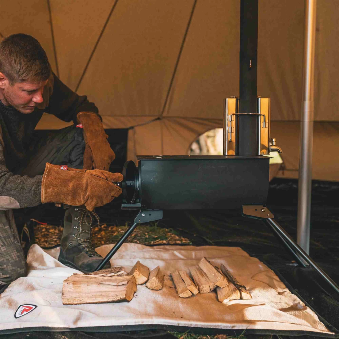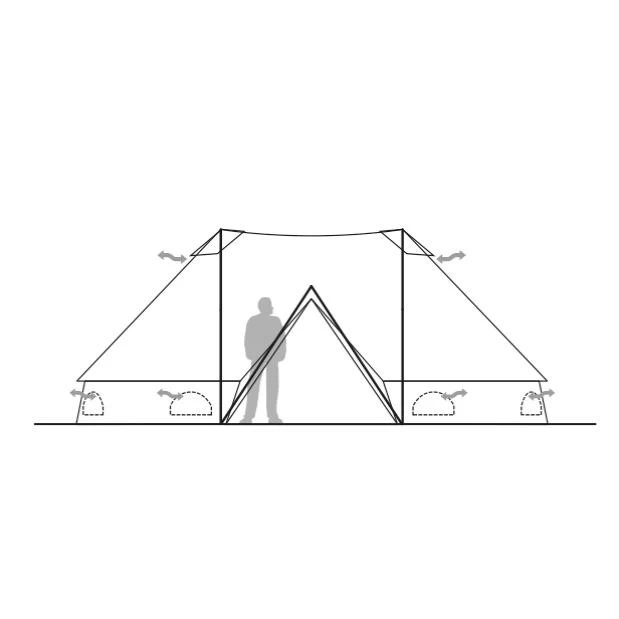 Der wasserdichte Zeltboden kann bei Bedarf komplett herausgezippt werden. Wenn er im Zelt liegt, sorgt er für einen trockenen, sauberen Bereich im Zelt. Vier Reißverschluss-Schieber schaffen vom Eingang bis in die Zeltmitte einen Bereich, in dem im Winter ein Zeltofen aufgestellt werden kann, oder der als Nassbereich für schmutzige Schuhe und Ausrüstung dient.