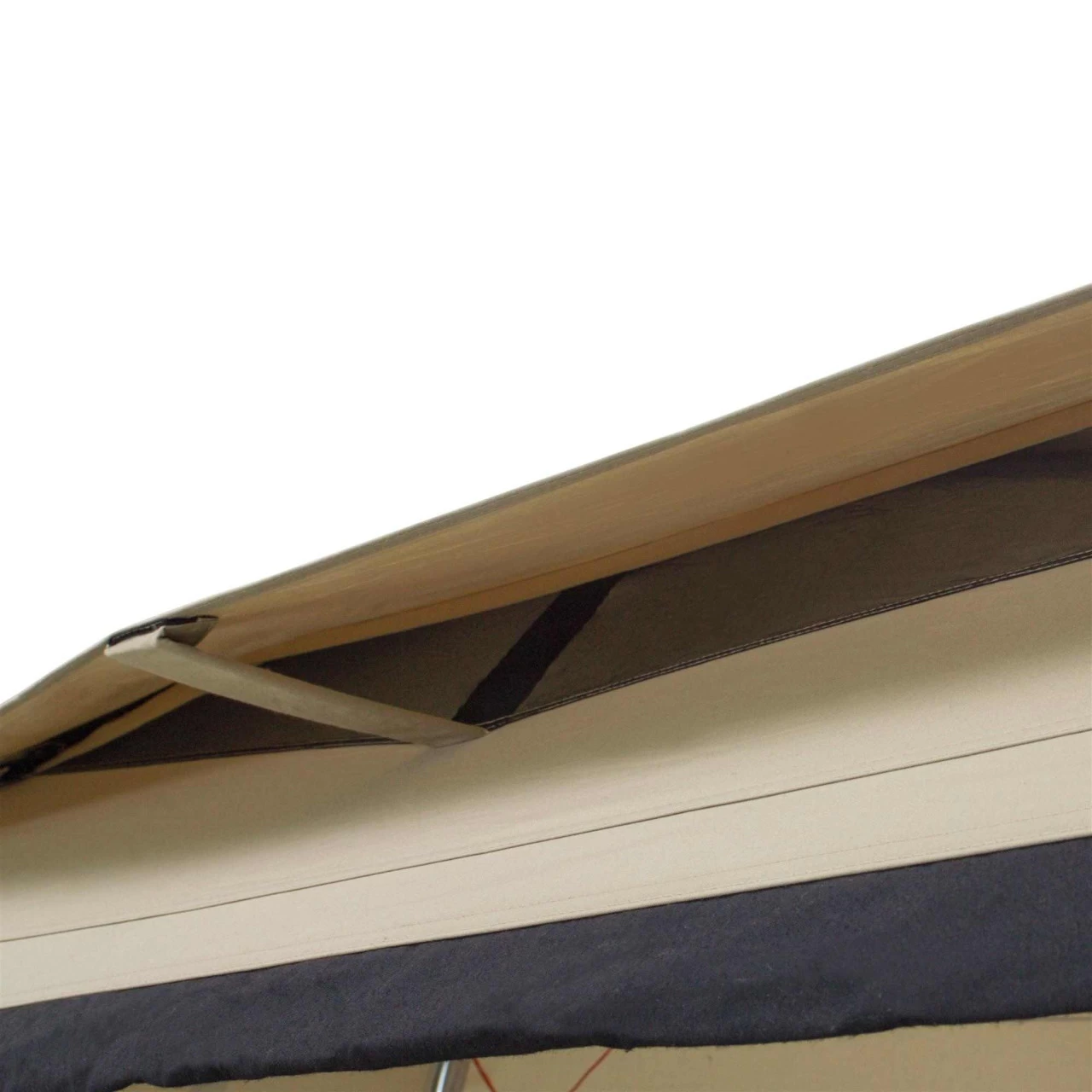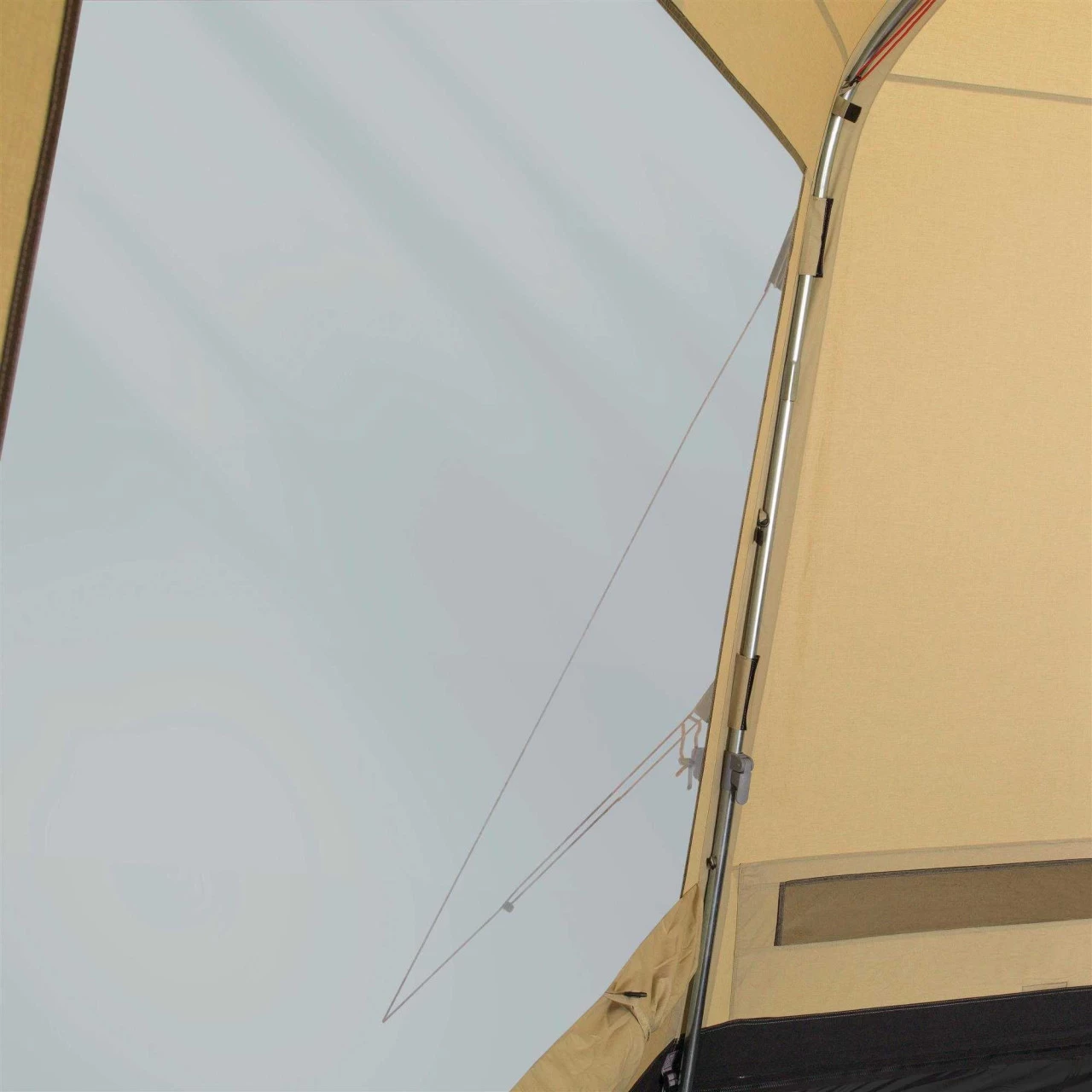 Die große Eingangstür ist mit einem Moskitonetz versehen und kann zum Belüften geöffnet bleiben, ohne das Insekten in die Yurt gelangen. Damit die Luft auch ordentlich zirkulieren kann, gibt es 2 große „Low Vent“ Systeme an den Seiten sowie eine Belüftung über der Eingangstür. Mit diesen Belüftungsöffnungen und dem atmungsaktiven Baumwoll-Mischgewebe steht einem kühlen Urlaub im Sommer nichts mehr im Wege.