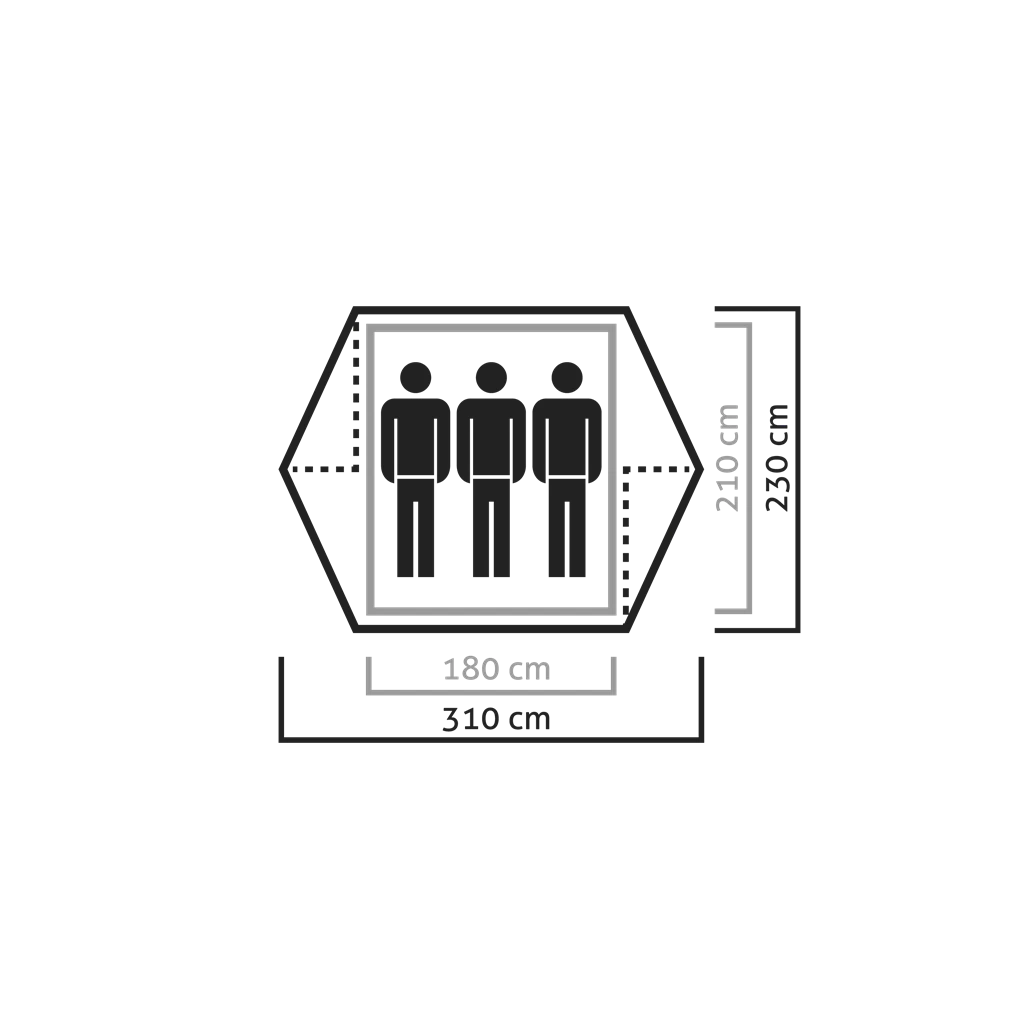 Das Salewa Denali II Kuppelzeit für drei Personen bleibt auch bei Dauerregen dicht. Die seitliche Belüftung sorgt dafür, dass es an warmen Tagen im Inneren nicht stickig wird. Die Apside des Trekkingzelts dient als Stauraum, der Eingang ist regengeschützt.