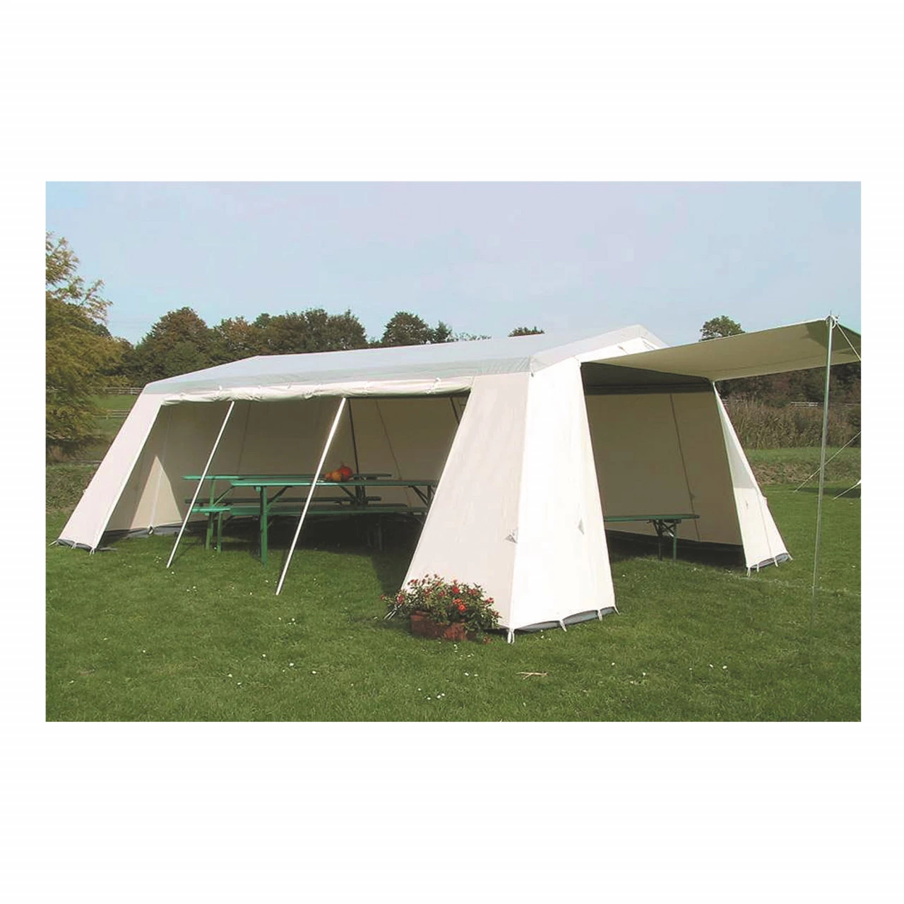 Das Tortuga Alabama Gr.2 Gruppenzelt ist ein klassisches Gerüstzelt. Sie können sowohl den Eingang, die Rückwand und die linke Seitenwand komplett aufrollen und als Vordach aufstellen, sodass Sie über einen luftigen und schattigen Aufenthaltsraum verfügen. Die Mittelhöhe von 215 cm bietet eine komfortable Kopffreiheit, vor allem wenn Sie eine Bierzeltgarnitur in dem Gerüstzelt aufgestellt haben. Die Baumwollzeltwand und die abgedeckten Moskitotüllfenster sorgen mit der Hochentlüftung im Vorder- und Hintergiebel für ein angenehmes Klima im Zelt. Nach dem BBQ können Sie Ihre Feldbetten auspacken und mit bis zu 16 Personen in dem Gerüstzelt nächtigen. Das Tortuga Alabama Gr.2 Gruppenzelt ist deshalb eine praktische Ausrüstung, die nicht nur als Lager überzeugt.