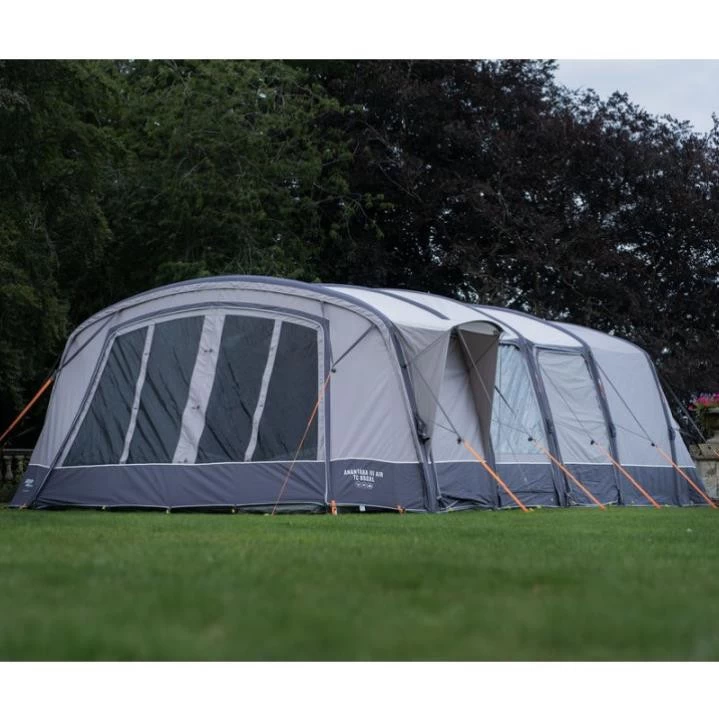 Das aufblasbare Vango Anantara IV Air TC 650XList ein großes Familienzelt mit einem Baumwoll-Mischgewebe und der revolutionären AirBeam® S.I Pro-Technologie von Vango, die das Aufstellen noch einfacher macht. Du musst das Zelt nur ausgebreitet hinlegen, an den Eckpunkten fixieren und mit der mitgelieferten Doppel-Hub-Pumpe aufpumpen. Das Sentinel Elite Gewebe ist eines der stärksten und haltbarsten Gewebe in der Vango Kollektion. in der TC-Version ist es eine Mischung aus 65% Polyester und 35% Baumwolle. Die Wassersäule liegt bei 5.000 mm. Die Eingangstür ist mit “Climate Pro Windows” ausgestattet. Hierbei handelt es sich um “3-lagige Fenster”: komplett offen schützen sie durch ihr durchgehendes Mesh vor Insekten, bieten aber eine optimale Belüftung. Wenn das Wetter schlechter wird, schliest du die Tür einfach mit einem PVC-Fenster. Wenn du am Abend deine Privatsphäre genießen willst, machst du zusätzlich noch den Vorhang zu und schon kann kein Nachbar mehr ins Zelt schauen. Über die gesamte Fläche des Vango Anantara IV Air TC 650XL ist eine robuste, strapazierfähige und wasserdichte PE-Bodenplane eingenäht. Es gibt mehrere Kabeleinführungsmöglichkeiten und am Eingang ist eine Kabelführung so angebracht, dass du ein Kabel ordentlich in den Markisenbereich an der Vorderseite des Zeltes führen kannst.
