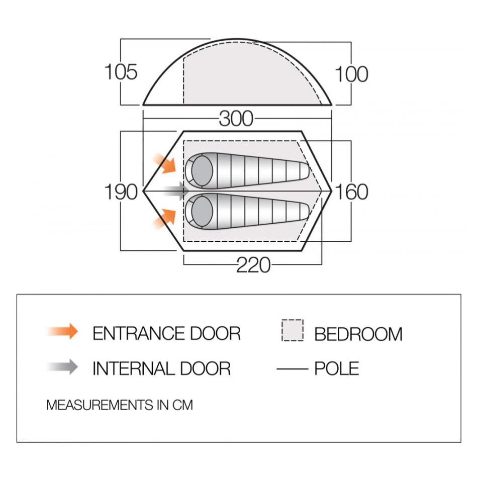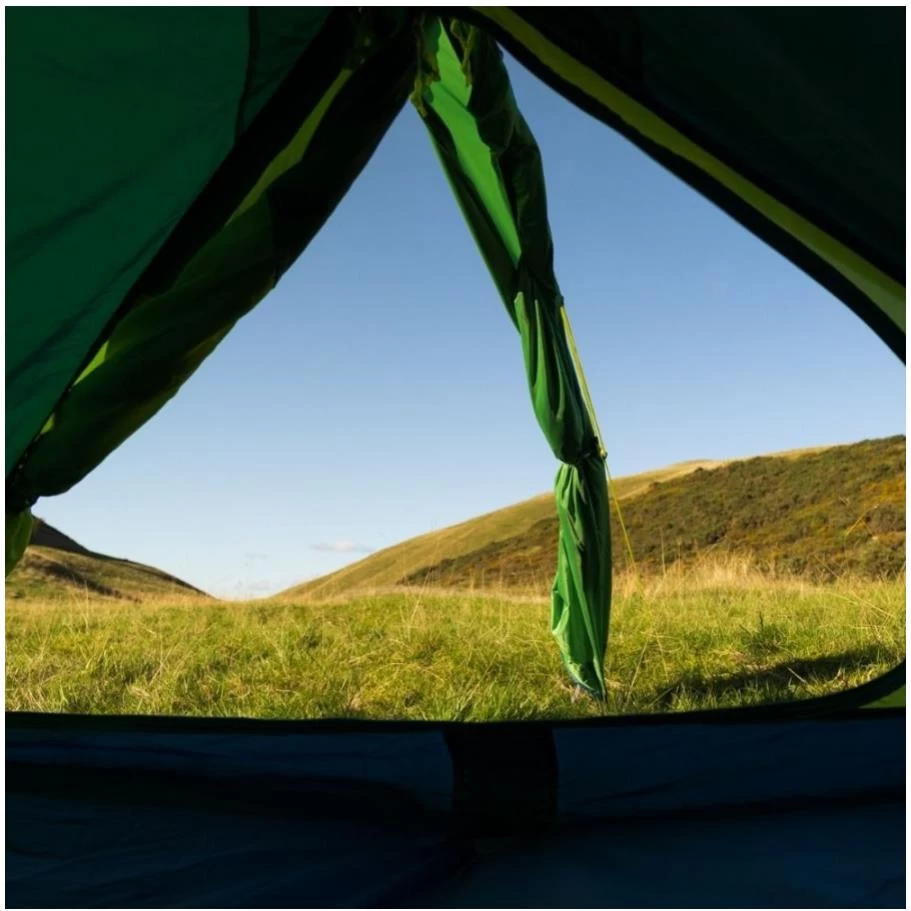 Das Vango Blade 200 lässt sich mit nur einer einzigen Aluminiumstange aufbauen. Die Stange wird am Innenzelt befestigt und das Innenzelt aufgestellt, bevor das Außenzelt darüber gelegt wird. Bei schönem Wetter kannst du das Innenzelt auch ohne Außenhaut benutzen. Die Rip-Stop Verstärkungen im atmungsaktiven Innenzelt erhöht die Lebensdauer. Die Tür des Vango Blade 200 ist clever durchdacht. Sie kann zu beiden Seiten hin geöffnet werden, so dass du den Eingang bei schlechtem Wetter schützen kannst. Du kannst die Tür aber auch komplett aufrollen, damit noch mehr Luft ins Zelt gelangt. Bei Bedarf kann die Tür auch von oben geöffnet werden. Um deine persönlichen Dinge immer griffbereit zu haben, sind im Zelt Innentaschen angebracht. Damit keiner über dein Zelt stolpert, sind die Abspannleinen orangefarben und reflektierend.