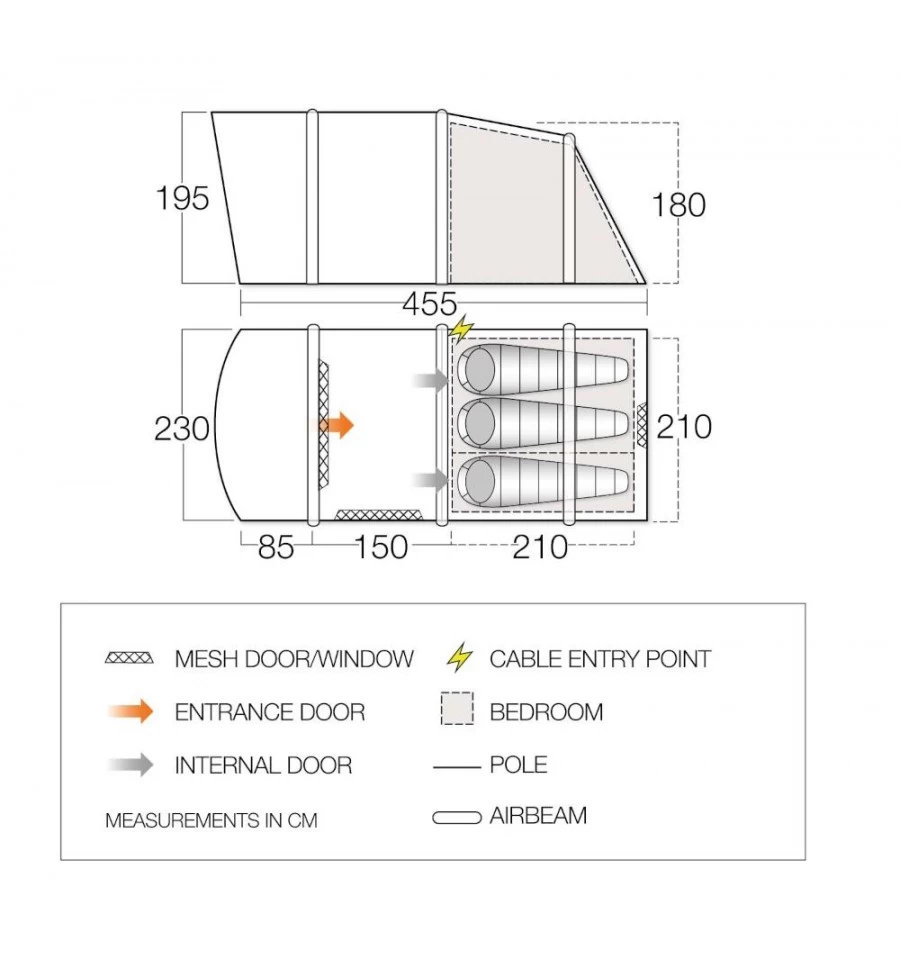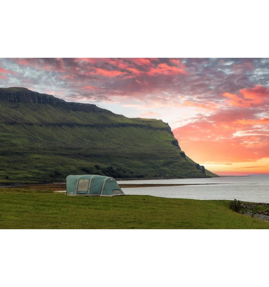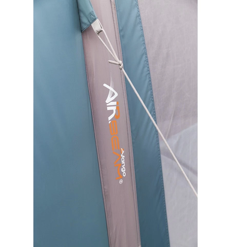 Der Fokus bei der Entwicklung des Vango Harris Air350 liegt auf der Belüftung, was es zum perfekten Zelt für den Sommerurlaub mit der Familie macht. Die große Fronttür mit einem zweigeteilten Moskitonetz lässt sich komplett zur Seite aufrollen, um das Zelt komplett zu öffnen. Dadurch schaffst du auch an heißen Tagen ein angenehmes Zeltklima. Außerdem befinden sich im Wohnbereich zwei große Belüftungsöffnung mit Moskitonetz-Einsatz. Das Außenzelt besteht aus dem eigens von Vango entwickelten Sentinel Gewebe, das in Sachen Gewicht und Packmaß überzeugt. Es ist sehr strapazierfähig und langlebig und hat eine Wassersäule von 3.000 mm. Der Boden des Zeltes besteht aus Polyäthylen (PE). Das Vango Harris Air350 ist ein Luftgestängezelt, es wird über ein Ventil innerhalb weniger Minuten aufgeblasen.