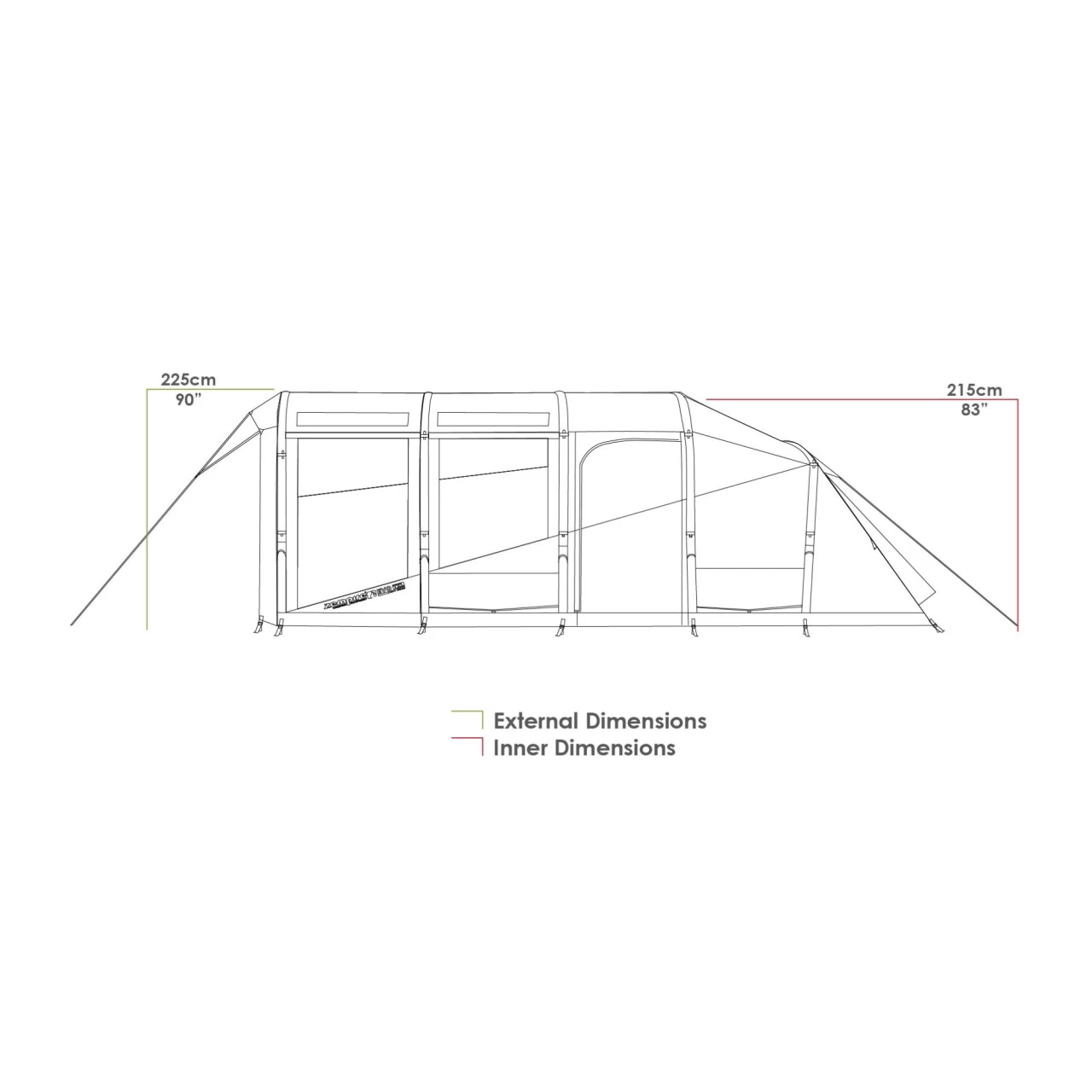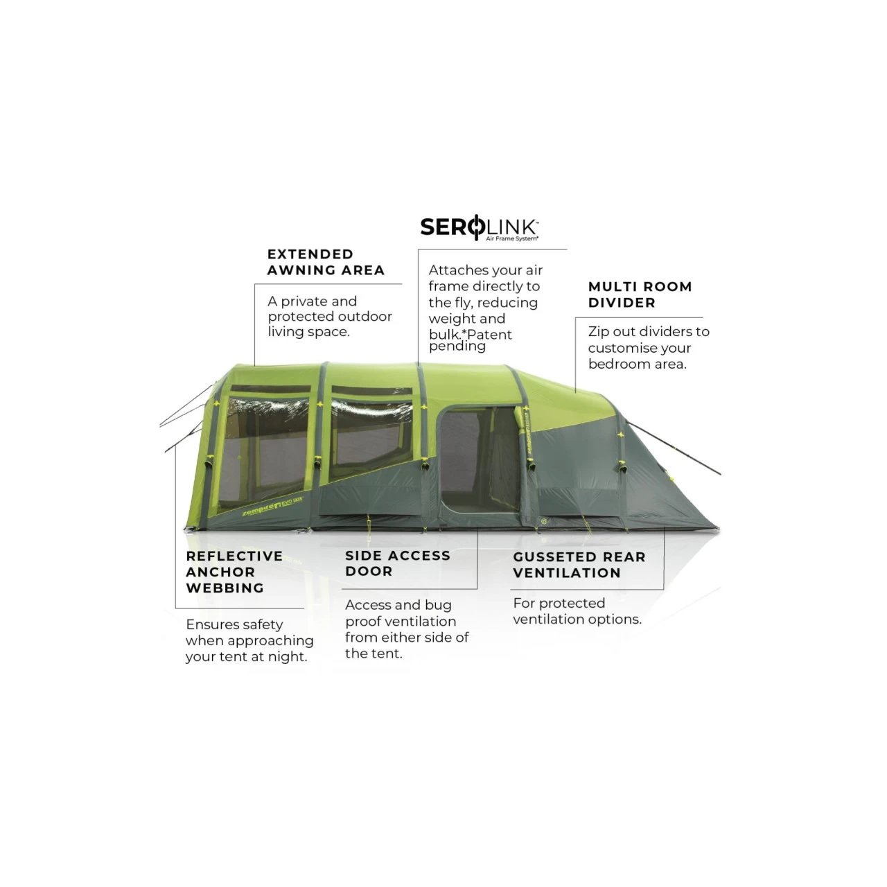 Das Zempire Evo TXL V2 Familienzelt ist das ideale Einsteiger-Zelt für Paare oder Familien. Der große Vorraum, die PVC-Dachfenster und die hervorragende Belüftung machen das Evo TXL V2 Familienzelt zu einem komfortablen Zelt. Ein lichtreflektierendes Material innerhalb der Schlafkabine sorgt für ungestörten Schlaf an Morgenden. Die abgewinkelte Balkenkonstruktion bietet verbesserte Windstabilität und Kopffreiheit im gesamten Zelt. Ein doppelwandiges Fenster erzeugt einen angenehm kühlen Luftstrom in warmen Nächten. Getönte PVC-Fenster bieten Privatsphäre im Zelt, ohne die Sicht einzuschränken. Dank dem aufblasbaren AirFrame System ist das Zelt im Handumdrehen auf- und abgebaut. Zusätzlich kommt die SeroLink Technologie zum Einsatz, die das Gestänge direkt mit dem Außenzelt verbindet. Dies sorgt nicht nur für ein Plus an Belastbarkeit und Flexibilität, sondern spart auch noch Gewicht. Darüber hinaus garantiert die abgewinkelte Konstruktion eine maximale Kopffreiheit. Das Außenzelt aus strapazierfähigem Oxford Polyester verfügt über getapte Nähte und bietet somit auch bei Starkregen zuverlässigen Wetterschutz.